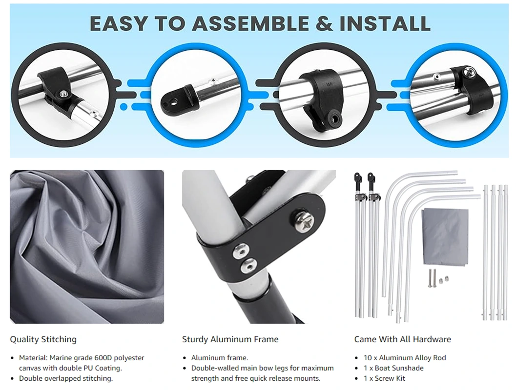 Алюминий ұзартылатын қайық қалқасы. Үрлемелі қайықтар, каноэ, байдарка, балық аулау қайығына жарамды. Біздің қайық көлеңкесі сізді күн мен жаңбырдан сақтайды, бұл Runabout қайықтары, V-Hull қайықтары, Джон қайықтары, бас қайықтары, үрлемелі қайықтар, шыны талшықты қайықтар үшін өте ыңғайлы. құралдарды оңай және жылдам орнатуға мүмкіндік береді.