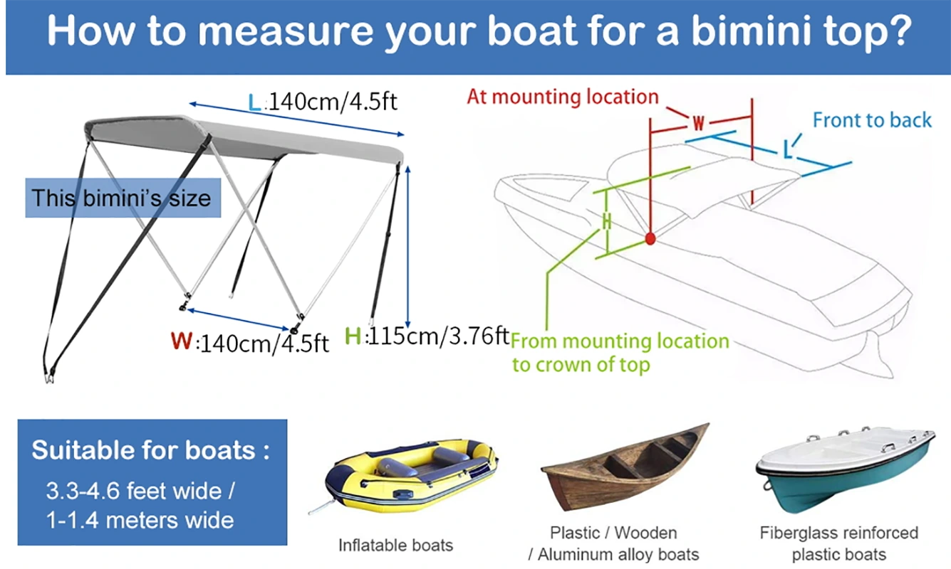 210D Оксфорд матасынан жасалған шатыр, ылғалға төзімді, жаңбырға төзімді. 210D теңіз материалы Бимини үстіңгі бөлігі - теңізге арналған көп функциялы күн қорғанысы, ол күннің ыстығына төтеп бере алады және сізді және сіздің отбасыңызды теңізде қауіпсіз жайлы және еркін тәжірибеден ләззат алу үшін сақтай алады.
