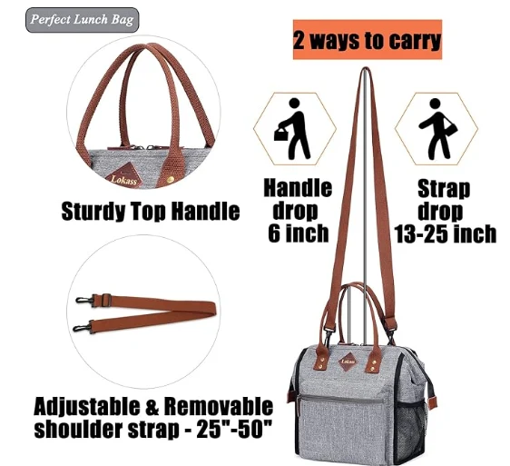 Үлкен түскі ас сөмкесінде негізгі бөлім бар (10,5 «X6« x12 »), үлкен қара сыйымдылық (8» x7 «x1.5»), артқы қалта (9.5 «x6.5») және 2 бүйірлік тор қалталары бар. Оңай ұстайтын және реттелетін және алынбалы иық бауы (25 »-50») оңай тасымалдау үшін.