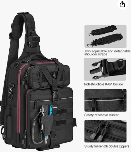 Иық белдіктері бұл дорбаны бұл сөмкені сөмке, рюкзак, сөмкелер, кеудеге арналған сөмке, балық аулау сөмкесі немесе саяхат сөмкесі ретінде пайдалану оңай етеді. Тауықтарды ұстап тұру үшін екі шыбық белдеуімен, белдіктің негізгі ұзындығы 51.2 '' дейін ұзартылуы мүмкін, ал бекіту белгісі 36,2 '' дейін созылуы мүмкін