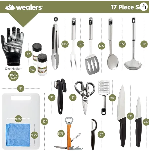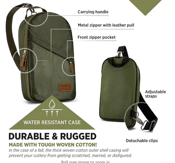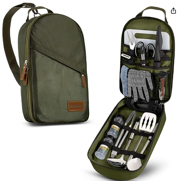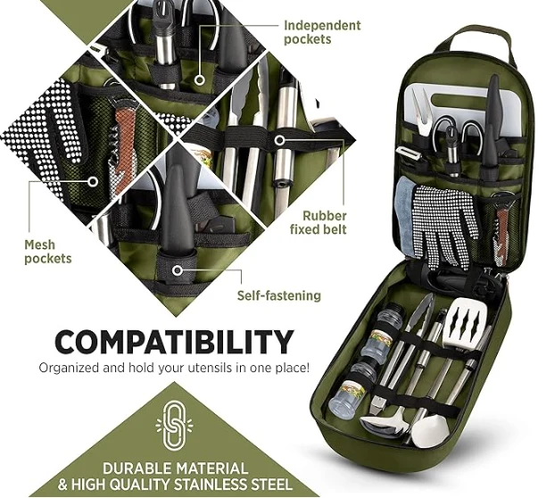 Сыртқы ашық кемпинг құралдарының пакеті, әр ыдыста өзіңе тағайындалған дорба бар, сондықтан қондырғылармен жағылмаған, сызылған немесе бүлінген немесе транзит кезінде бүлінген немесе зақымдалмайды. Пісіру ыдыстарына оңай қол жеткізуге мүмкіндік береді және ол қауіпсіз Zip тығыздағышымен жабдықталған